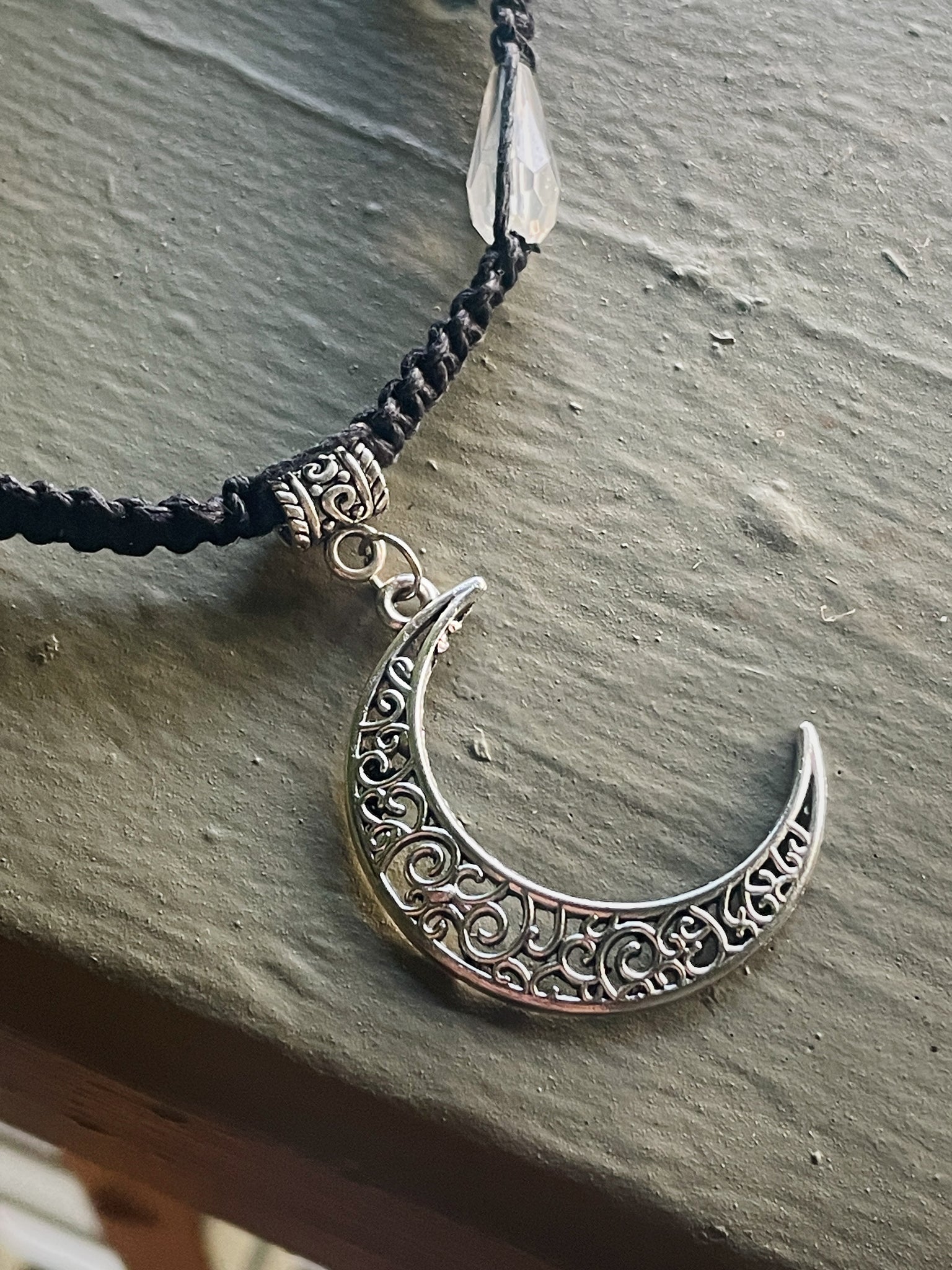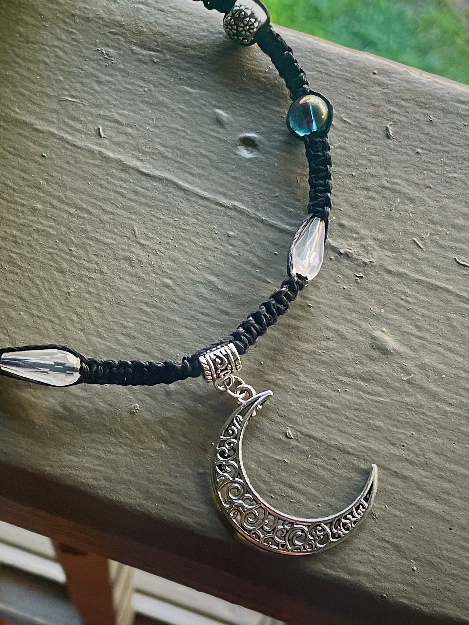 Handmade macrame necklace made by kenzie! This necklace has the coolest moon charm and gorgeous beads to go along with it. You can easily connect the two sides by the button system in the back of the necklace! Perfect for anybody!