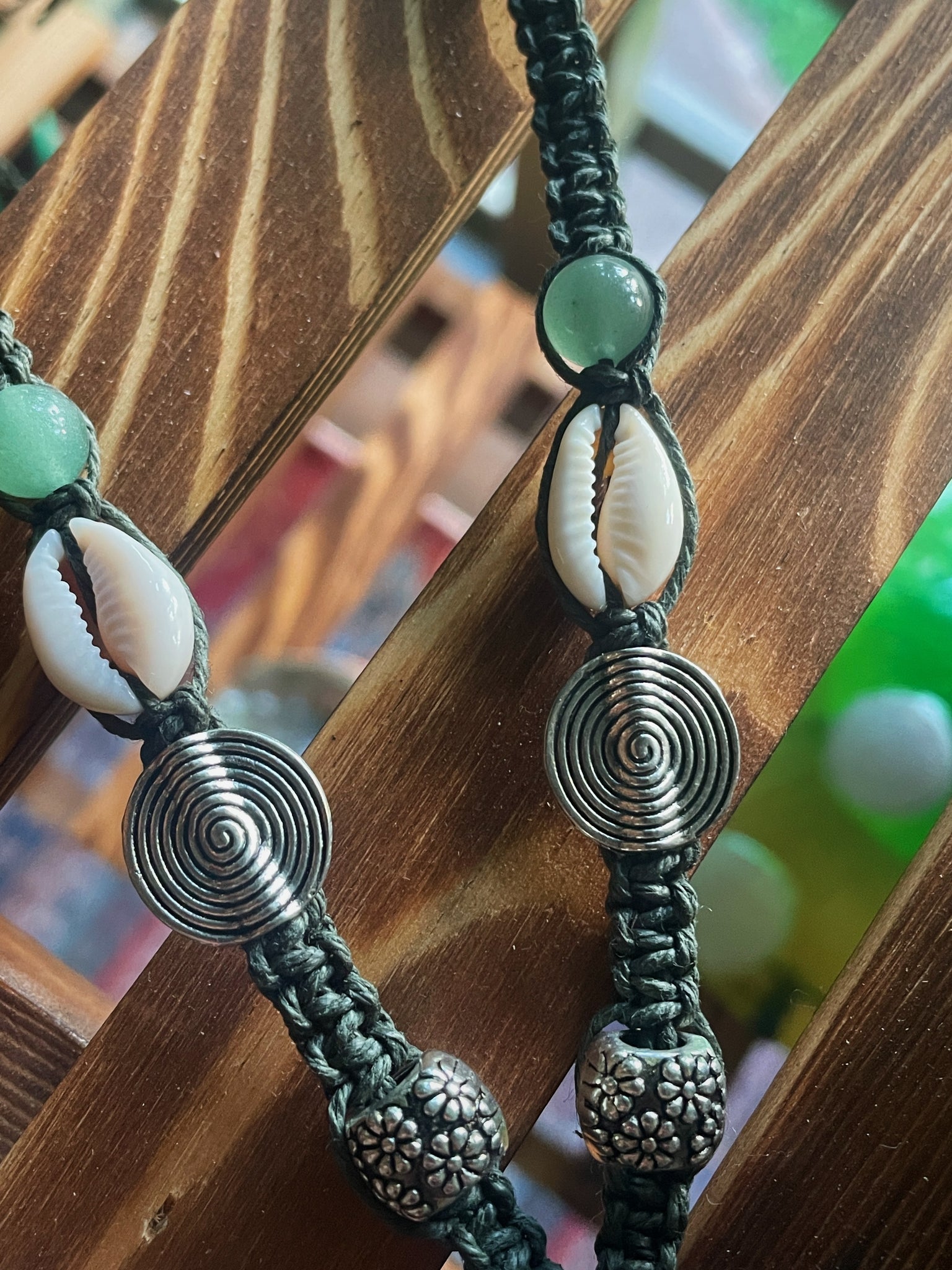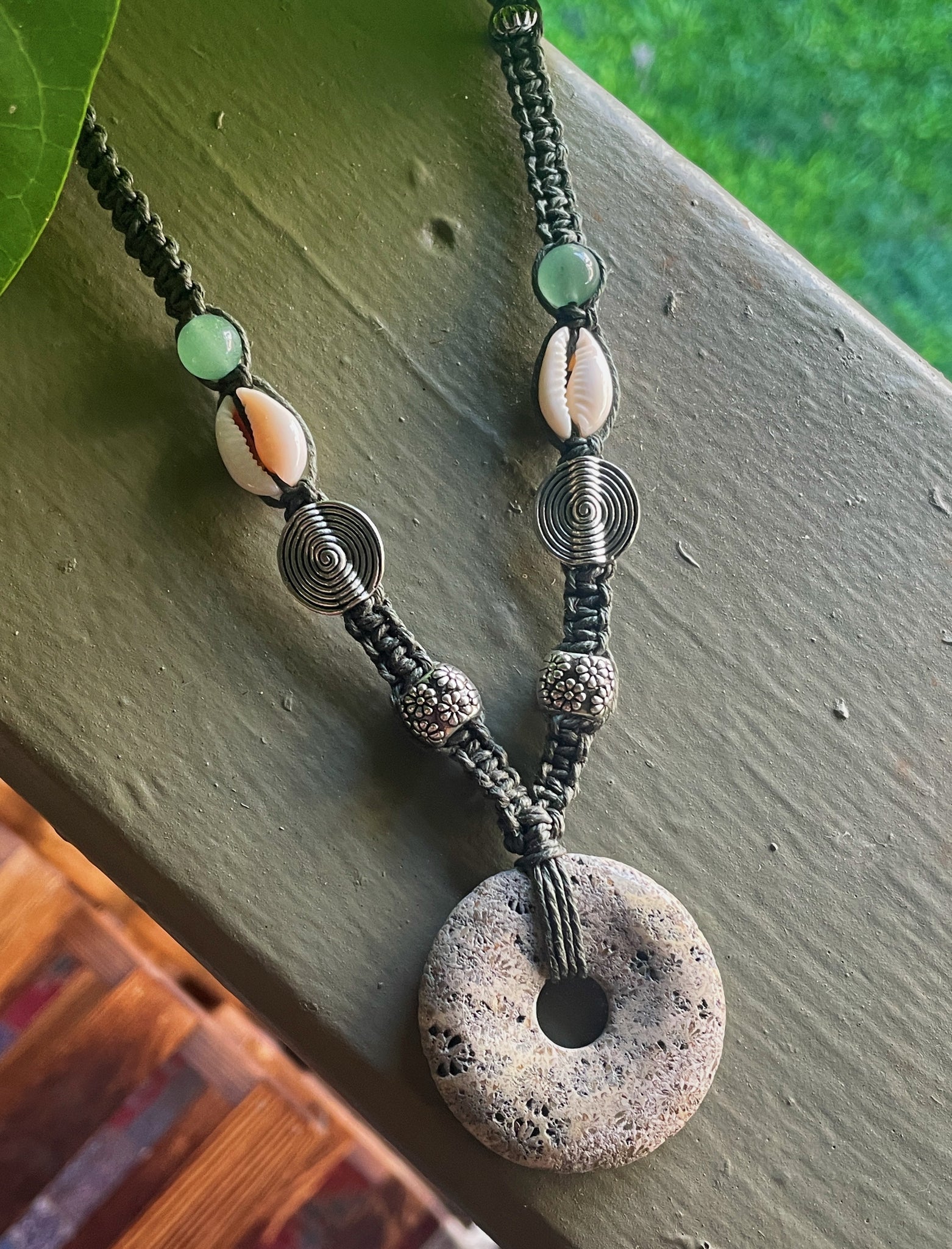 Handmade macrame necklace made by kenzie! This necklace has the coolest coral fossil charm and gorgeous puka shell beads to go along with it. You can easily change the length of this necklace by pulling on the two strings in the back! That way you can wear it however best suits you for that day! Perfect for anybody!