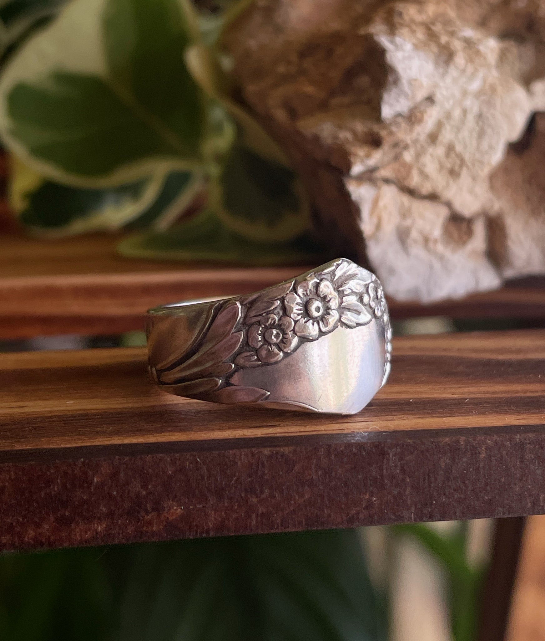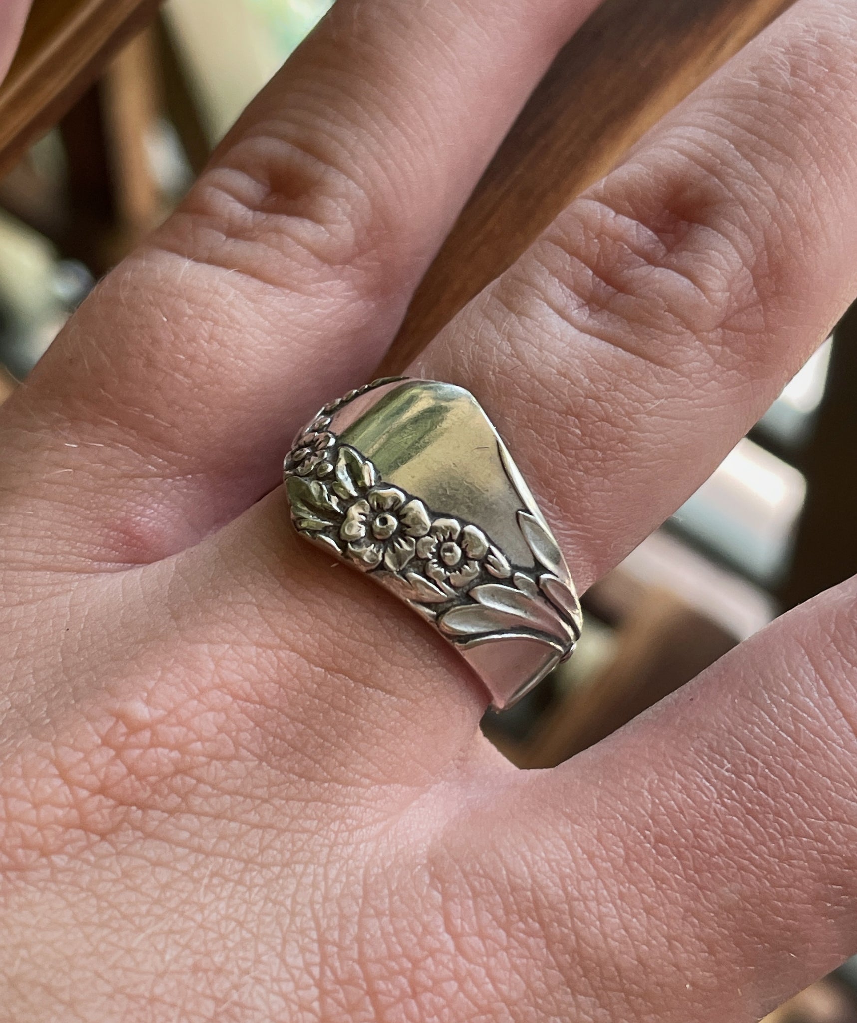 Size 7.5 Super cute and unique ring handmade from recycled silverware! These rings last super long and don’t rust! They are safe to be in water and soap so it is perfect for an everyday ring. No silverware ring is ever the same and each one has their own character!